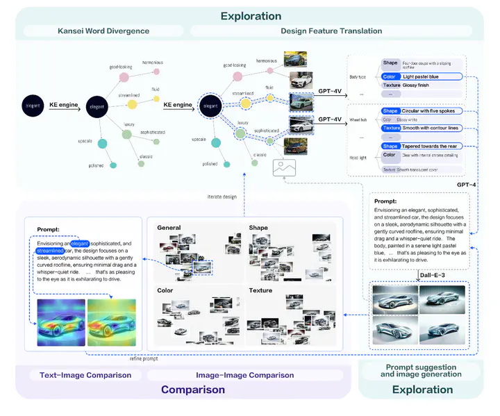 我们推出了 AutoSpark,这是一个集成了感性工程学和生成式人工智能的互动系统,为设计师创造满足情感需求的汽车外观设计提供创意支持。AutoSpark 采用由生成式人工智能和语义网络驱动的感性工程引擎来支持设计师进行情感词发散,情感词到设计特征的转译以及设计特征提取,从而帮助设计师实现情感需求对齐、设计意图的快速表达,并利用大语言模型根据提取出的设计特征进行提示词生成,帮助设计师快速利用文生图模型创建汽车图像。为了促进设计师对生成结果的理解和迭代,AutoSpark 利用 CLIP 模型辅助设计师对生成图像进行细粒度的相似性比较,利用 patch-inversion 算法可视化文本提示词和生成图像之间的相关性。AutoSpark 还在界面中提供了一个设计思维导图来帮助设计师高效管理设计过程。我们的用户研究表明,与基线系统相比,AutoSpark 能够有效地帮助设计师生成更符合消费者情感需求并且质量更高的汽车设计图像,同时也增强了设计师在人机共创过程中的体验。