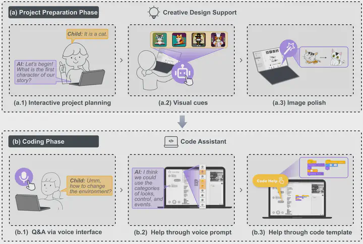 本文介绍了 ChatScratch 系统,这是一个针对 6 至 12 岁儿童自主学习视觉编程的 AI 增强工具。随着计算思维(CT)在 K-12 教育阶段的广泛推广,传统的 CT 平台,如 Scratch,面临着适应年幼学习者的挑战。这些学习者往往缺乏进行有效学习所需的基本技能,如阅读写作能力和手眼协调能力。此外,现有的教学实践通常依赖于教师的直接指导和严格的课程结构,这对于资源有限的地区的学生来说是一大障碍。