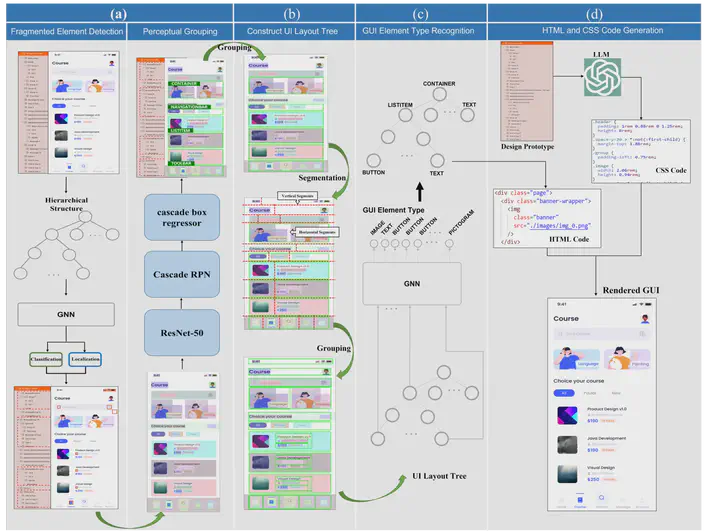 传统的 UI 到代码的转换技术通常依赖于设计原型的质量,而这些原型的质量参差不齐,常导致生成的代码结构混乱、不支持响应式布局等问题。本研究提出的 Prototype2Code 通过整合设计原型的语法检查,针对发现的元素碎片和感知分组进行优化,提高了代码的可读性和结构清晰度。在技术实现上,Prototype2Code 应用图神经网络和大型语言模型,自动从 UI 原型中识别和分类 UI 元素,如文本、图片和列表项,并基于这些信息构建 HTML 骨架代码和 CSS 样式代码。系统支持弹性盒子(flexbox)布局模型,确保生成的代码可以适配不同设备大小。